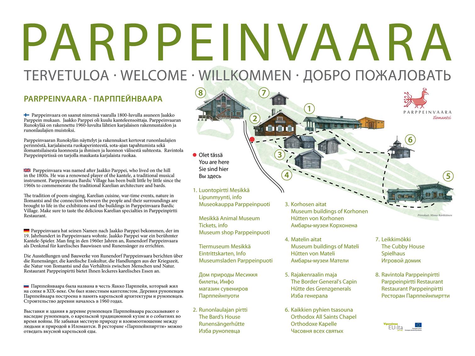 In addition to runic songs and playing the kantele in the Rune Singer’s House, one can also explore the exhibition which tells about the history of Parppeinvaara’s Rune Singer’s House, Finland’s national instrument, kantele and the history of runic songs in Ilomantsi, Finland’s easternmost municipality. The Runesinger’s House also showcases an extensive collection of the national epic, Kalevala in different languages. In summer, there are also themed exhibitions.