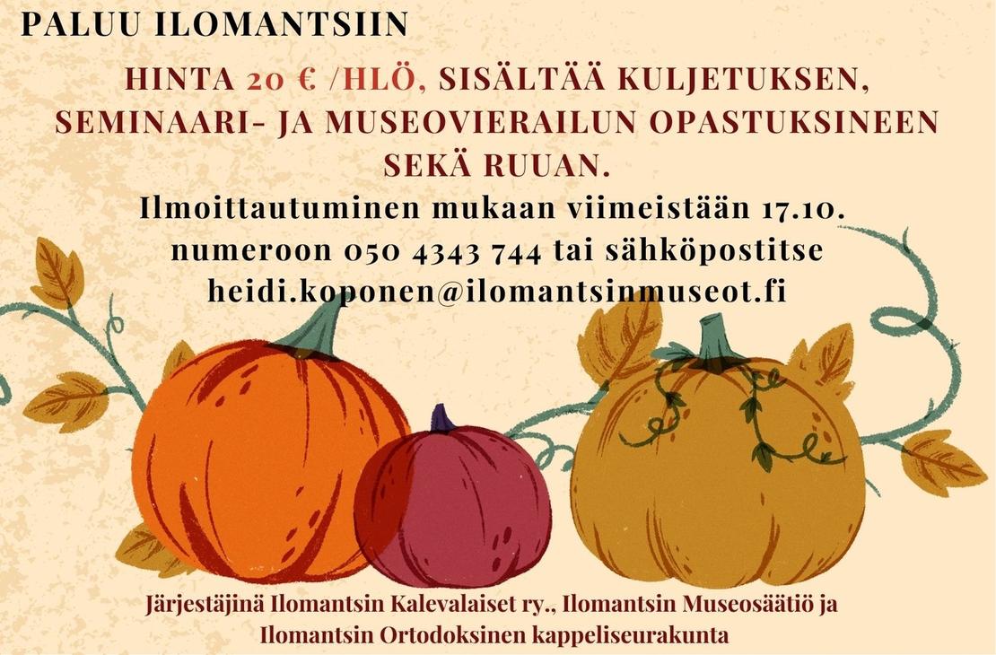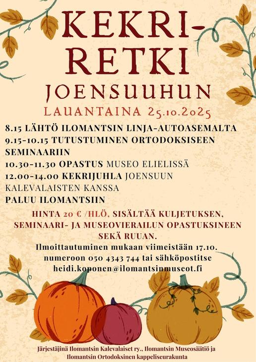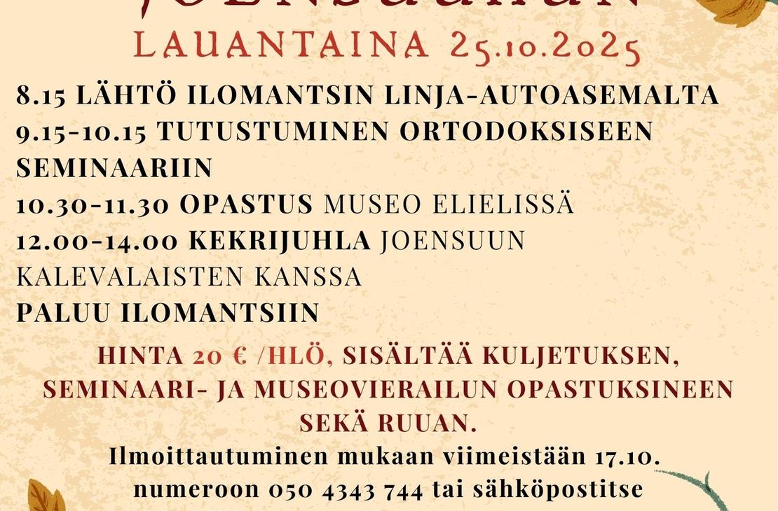 Tervetuloa Ilomantsin Museosäätiön, Ilomantsin Kalevalaiset ry.:n ja Ilomantsin Ortodoksisen kappeliseurakunnan järjestämälle Kekriretkelle Joensuuhun lauantaina 25.10.2025.